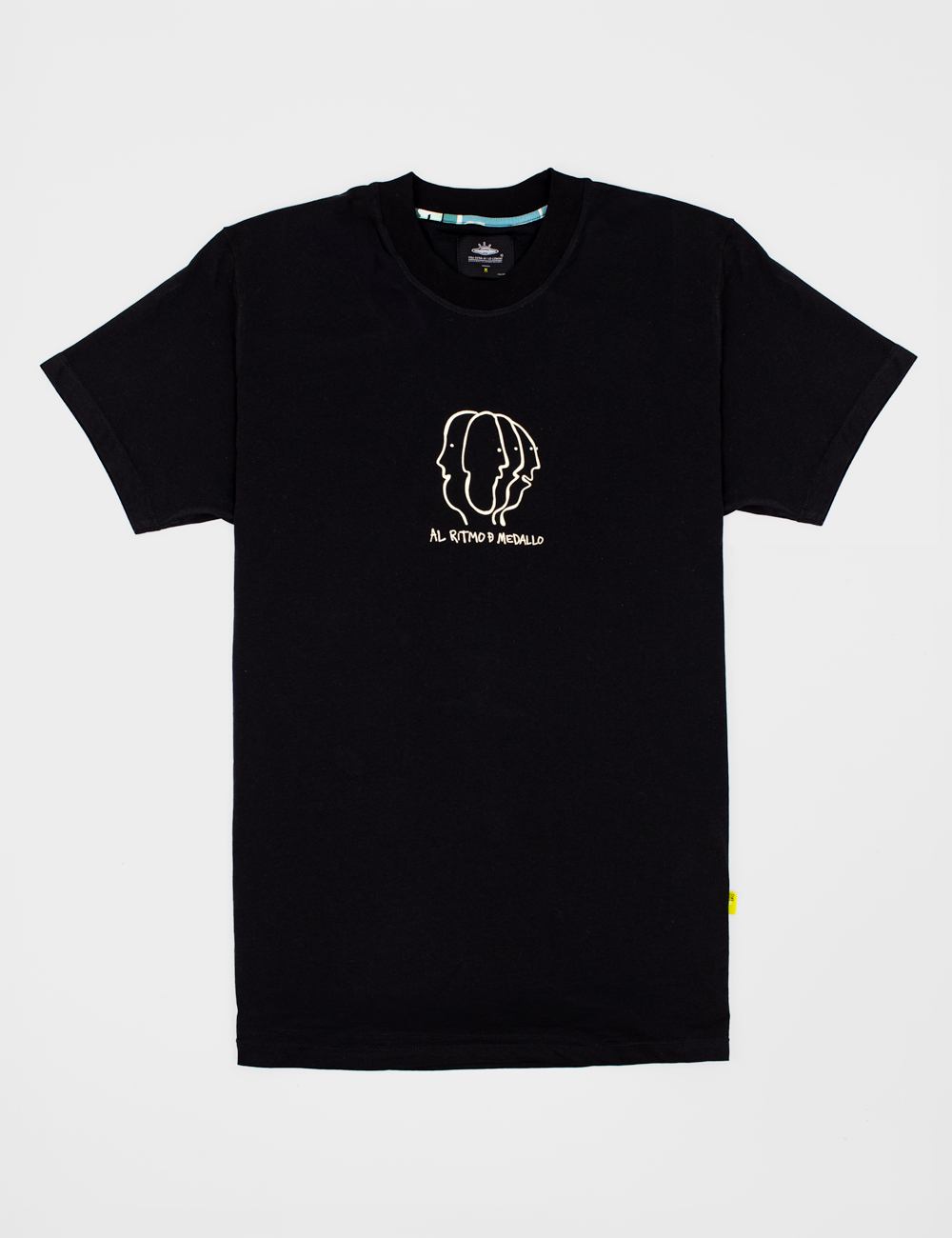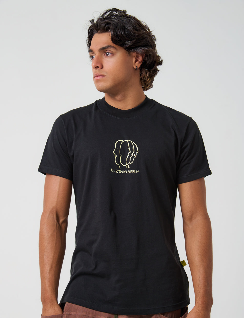 The graphic symbolizes the connection between celebration and music as a gesture of universal peace. Small abstract figures suggest people dancing and enjoying themselves, creating a festive atmosphere that invites everyone to join the rhythm. The contrast between the black of the T-shirt and the white of the design highlights Medellín’s creativity and joyful spirit.