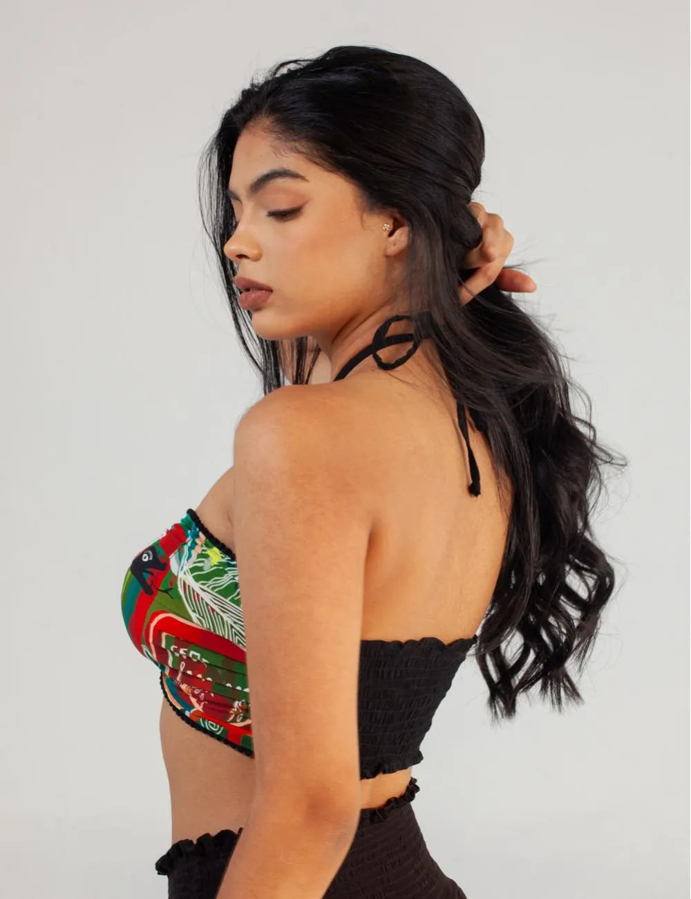 Our Yagé printed bra top, featuring graphics inspired by the dreamlike visions of ancestral ceremonies, invites you on an inner journey of self-discovery. Made from a soft and cool fabric, it’s perfect for moments of introspection and connection with yourself.