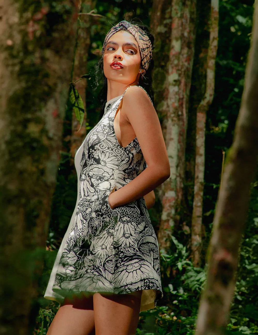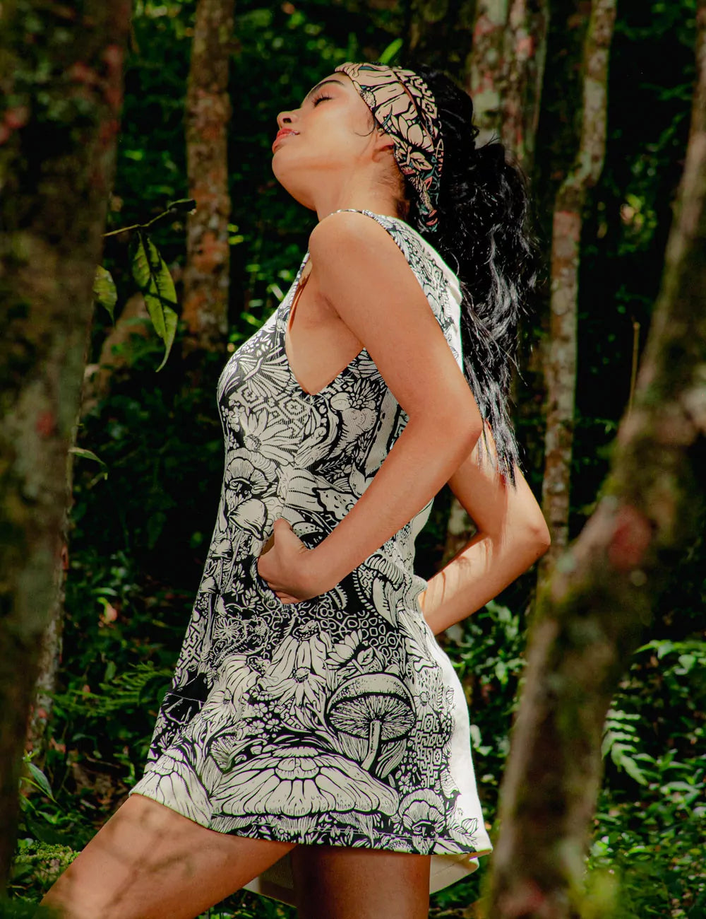 Dive into the serenity of nature with our Flora off-white dress. Its soft fabric and mushroom print will transport you to a bright, fresh forest. Perfect for connecting with your most authentic self.